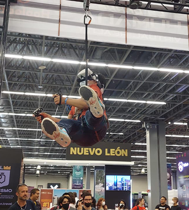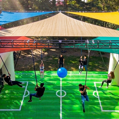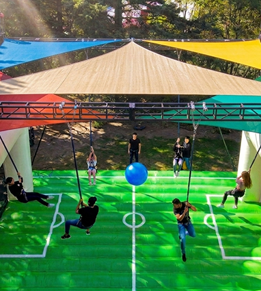 El fútbol ya no tiene los pies en la tierra. Vive una experiencia de juego en 360º suspendido por arneses y ligas de bungee. Brinca, gira y remata en el aire con nuestra dinámica de fútbol humano.